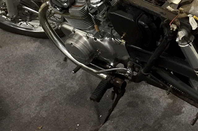 Samalla kun pyörää tutkiskelin huomasin että se on hieman vinossa keskiseisontajalalla ollessaan. Silmälläkin näki heti että jalka oli kierossa, joten ajattelin irroittaa sen ja paina prässillä suoraan. Irtonaista jalkaa tutkiessani huomasin kuitenkin että sehän ei ole edes alkuperäinen K4:n jalka, joten päätin hankkia uuden. Onneksi Henrin Four projektista oli jäänyt käyttämättömäksi alkuperäinen jalka, joka oli sama kun twinissä, joten se putsattiin maaleista ja pulverimaalattiin ennen asennusta paikalleen.